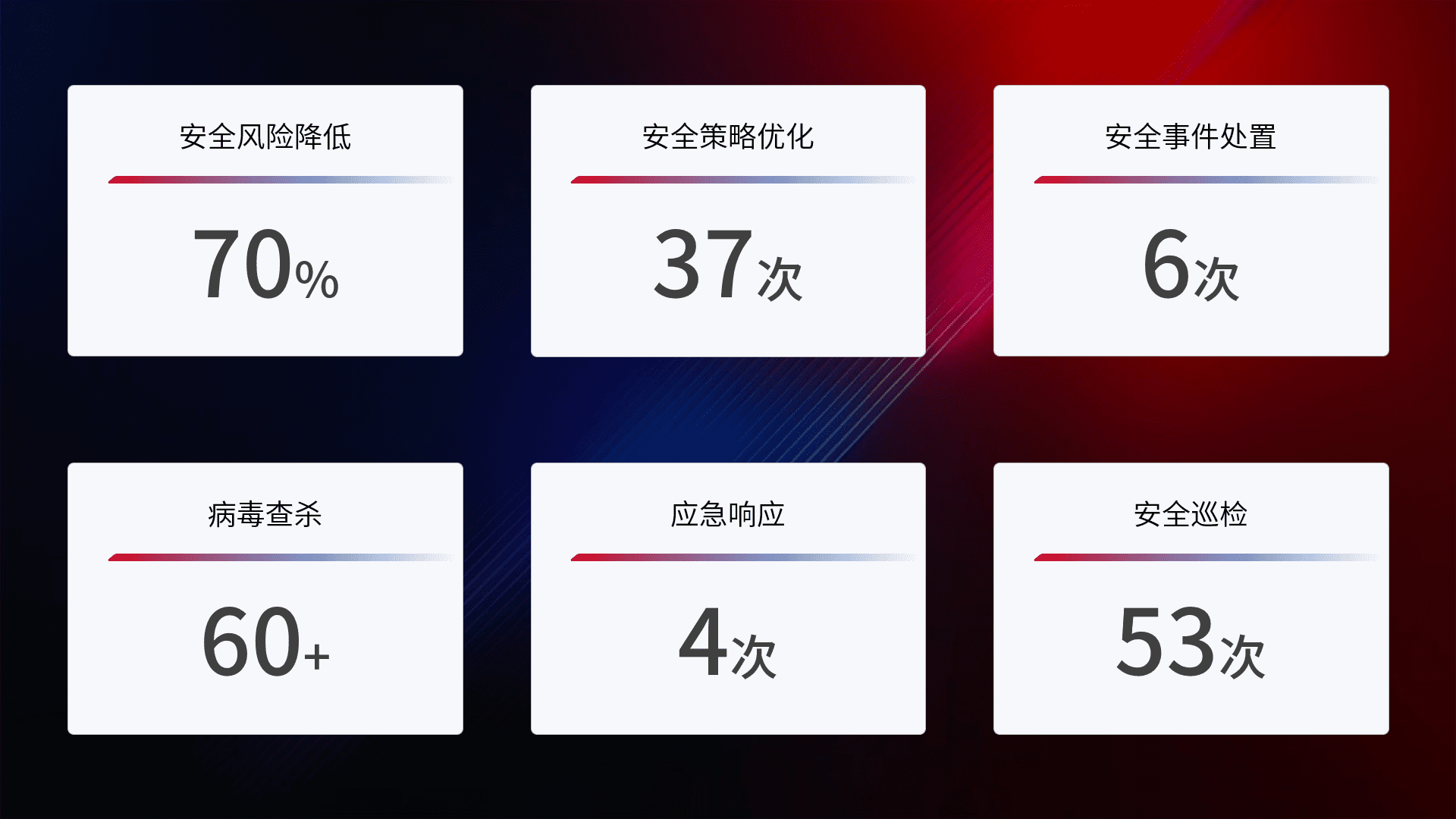 提供全面的安全事件报告体系,,,包括处置报告、、、周报、、、季度和年度总结,,,结合持续监控,,帮助客户深入了解网络安全状况。。。。